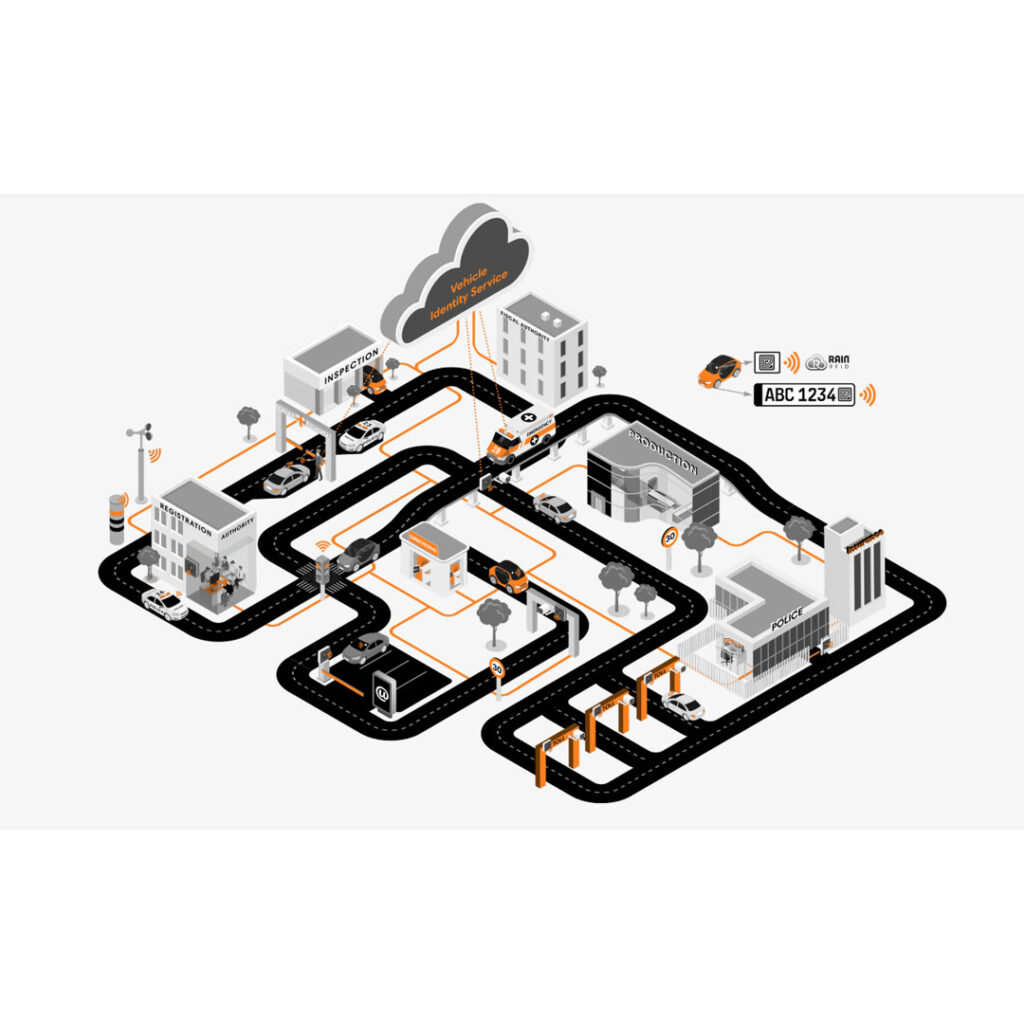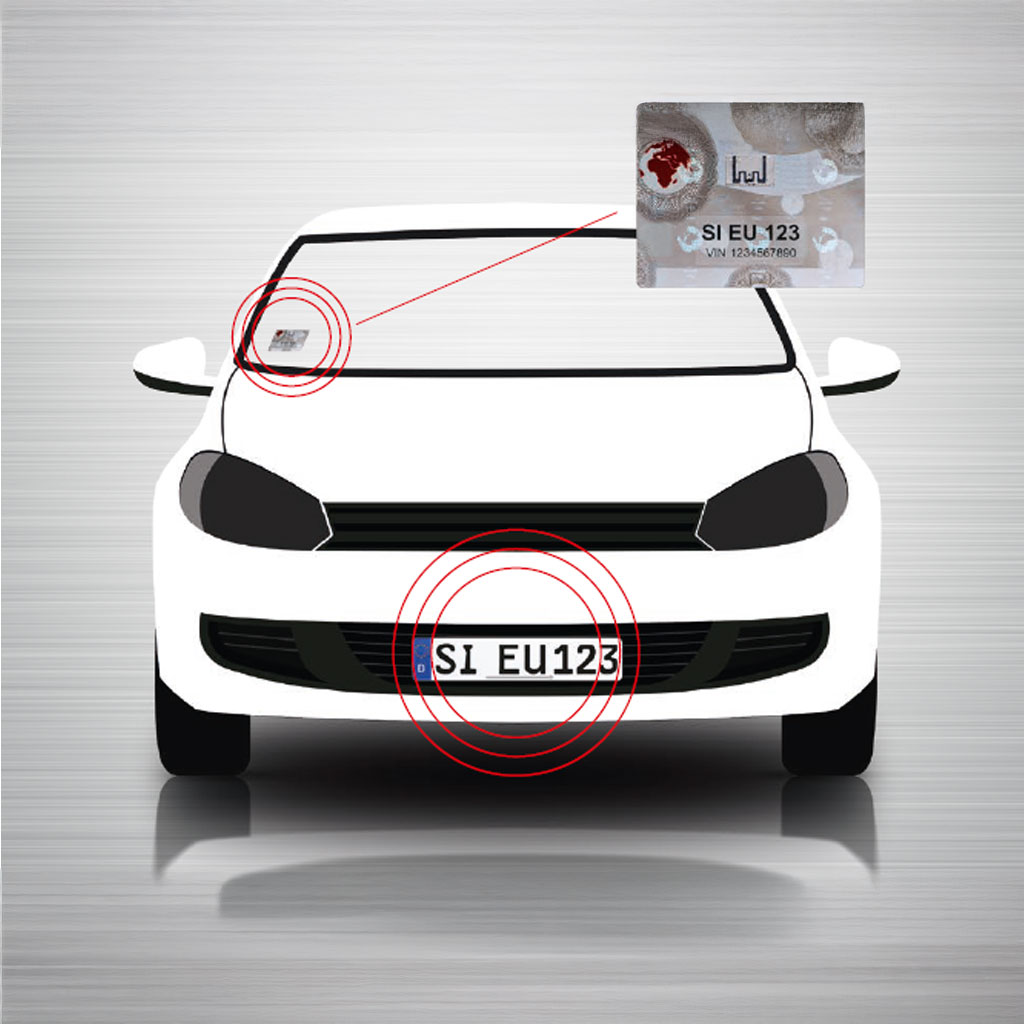 - The RFID license plate is equipped with a hot-stamped chrome-based OVD stripe.